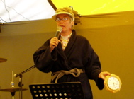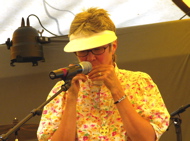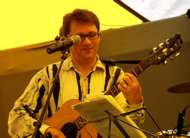 Målle Lindberg och Loket Olsson hade roligt på scenen i tältet vid Ulvsmålafestivalen. Målles ackompanjatör Lelle Lindberg i bakgrunden.